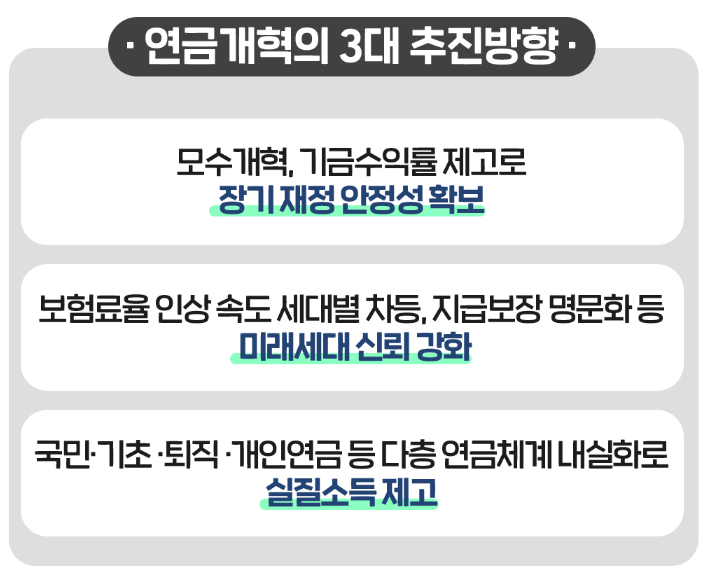 정부와 학계에서는 연금 개혁 필요성을 강조하고 있다. 개혁 방향으로는 보험료율 인상, 수급 연령 상향 조정, 지급액 조정 등이 논의되고 있다.