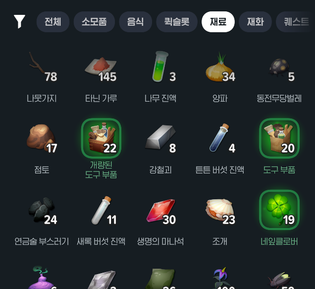 채집 아이템이 인벤토리에 있으면 자동화 루틴이 더욱 매끄럽습니다.