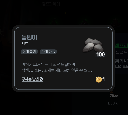 - 돌멩이 채집으로 캠프파이어 키트 제작 가능
