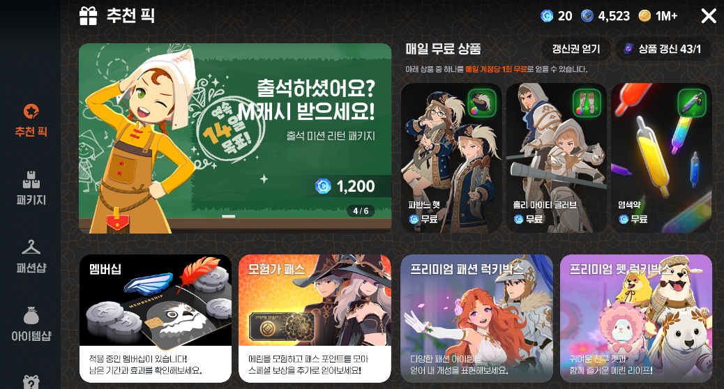 → 출석 리턴 패키지 구매 가능 + 14일 후 캐시포인트 1,200 환급도 받아요!