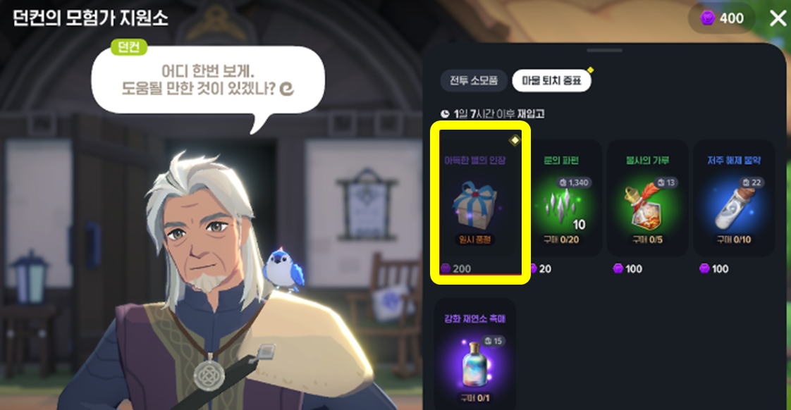 모험가 지원소의 촌장 던컨이 '아득한 별의 인장' 상자를 판매합니다. 이 상자는 '마물 퇴치 증표' 100개로 구매할 수 있습니다. - 던바튼 지역