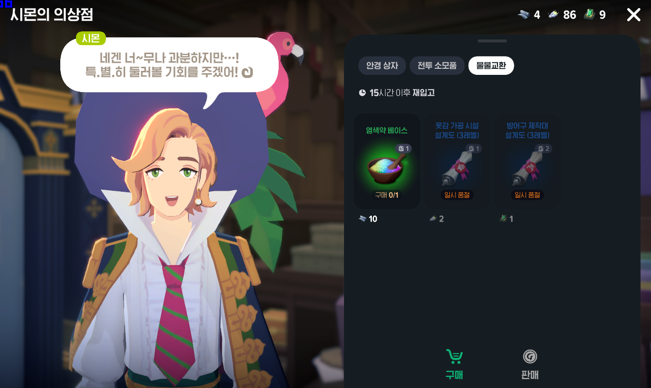 | 시설 | NPC 위치 | 요구 재료 | 특수 부자재 |