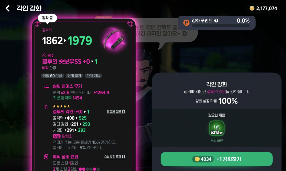 바로 제 주력무기를 각인강화 해보겠습니다.