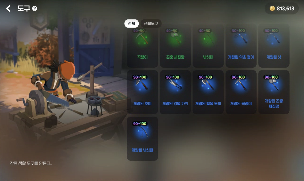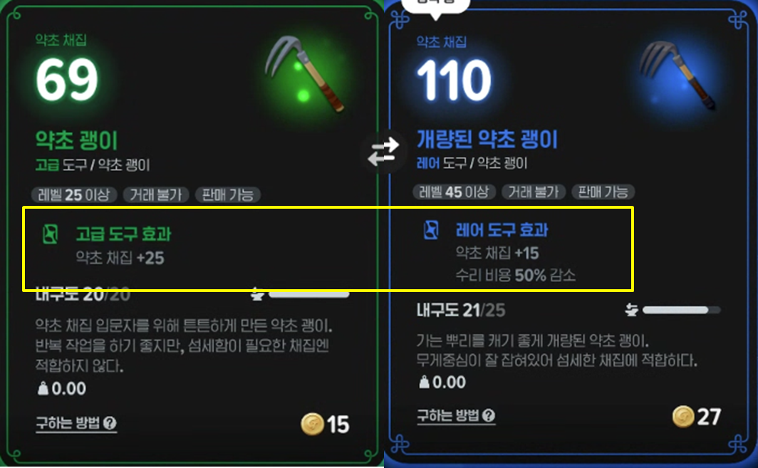특히 채집 도구는 등급과 성능에 따라 수급 속도와 재료 품질이 확연히 달라집니다.