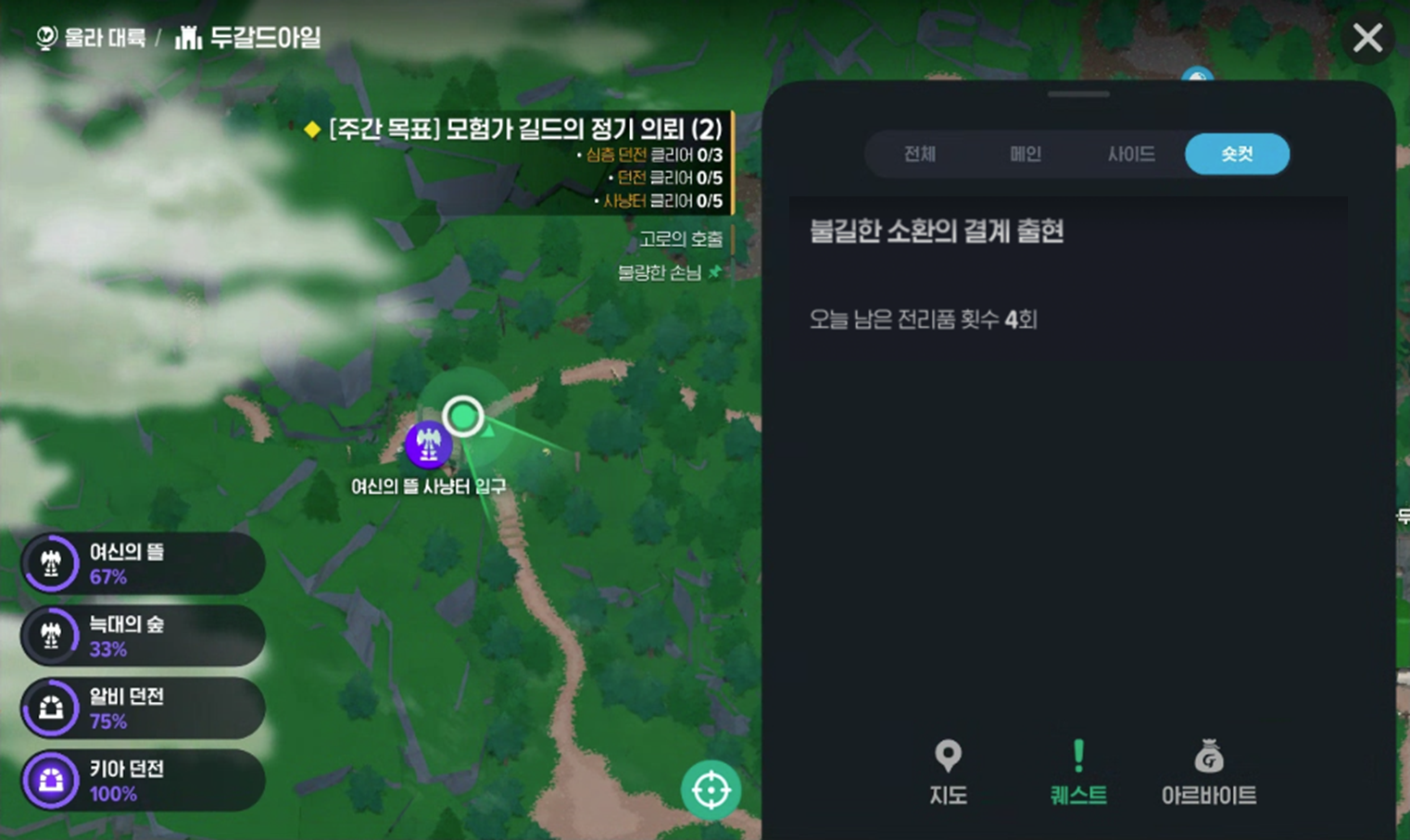 - 퀘스트 메뉴 → 숏컷 탭 진입