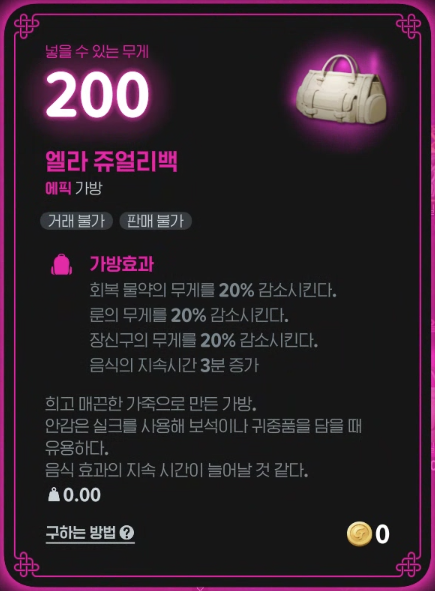 | 🎒 엘라 쥬얼리백 | 장신구 무게 감소 + 음식 지속시간 증가 |