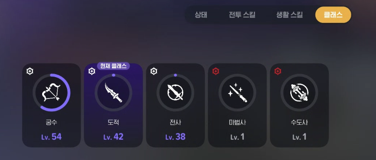 - 메인화면 좌측 상단 ‘프로필’ 메뉴 > [클래스] 탭을 선택한 뒤, 교체할 클래스를 지정하면 전환이 완료됩니다.