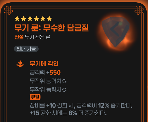 - 🔧 무수한 담금질: 장비 +10에서 공격력 12% 상승, +15 시 추가 상승