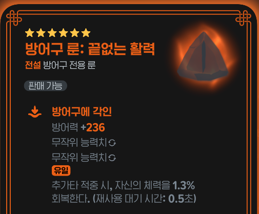 - 끝없는 활력: 추가타 명중 시 체력 회복 (1.3%)