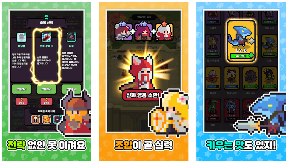 단순 뽑기 운에 좌우되지 않고, 도트 그래픽 영웅들의 조합 방식을 활용해
